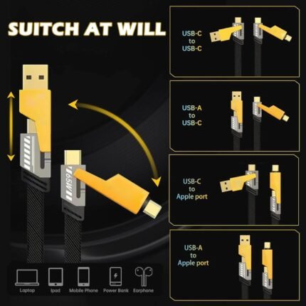 Mibexo 4-in-1 Fast Charging Cable 65W | Type-C, Lightning & USB-A Multi-Port Universal Cable | High-Speed Charging & Data Transfer for All Devices (1m)